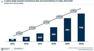 Il food delivery in Italia I dati parlano chiaro. Secondo le rilevazioni dell’Osservatorio eCommerce B2c del Politecnico di Milano, in Italia il settore economico della consegna a domicilio del cibo a domicilio tramite l’acquisto su piattaforme online è in forte crescita. Solo nel primo semestre 2020 ben 706 milioni di euro sono stati spesi per ordinare cibo a domicilio attraverso app di e-commerce. I dati confermano che il trend è in crescita a prescindere dalla pandemia di covid, ed anzi questa ha probabilmente ha dato un ulteriore boost alla crescita, così è molto probabile che nei prossimi anni il settore continuerà a svilupparsi.