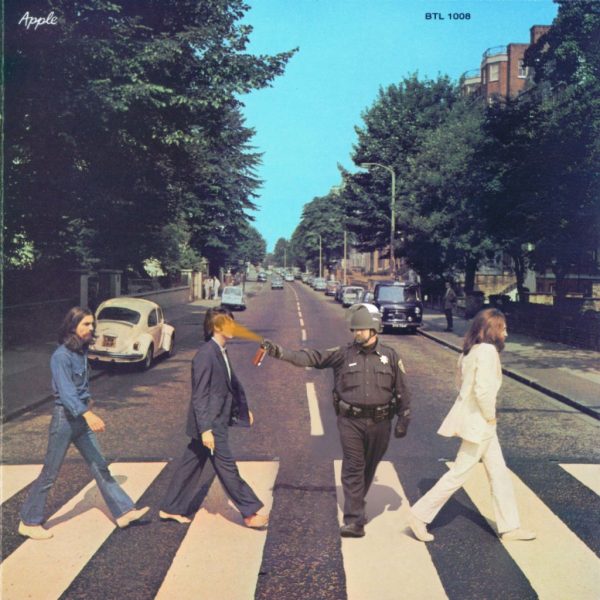 Il tenente Pike “il poliziotto con lo spray al peperoncino” passeggia attraverso l’iconica copertina di Abbey Road dei Beatles, spruzzando casualmente Paul McCartney. Questa immagine meditata gioca sulla popolarità dei Beatles per enfatizzare l’assurdità insensibile delle azioni di Pike.
