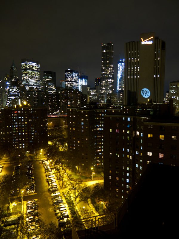 A poca distanza dalla passerella pedonale del ponte di Brooklyn si trova una lastra di cemento grigio a trentadue piani di un edificio comunemente noto come “l’edificio Verizon”. La facciata è una distesa piatta senza finestre di circa settantacinque piedi di larghezza, con una illuminazione circostante bassa. Progetti di edilizia residenziale di città alti quindici piani siedono nella sua ombra. Avevamo il nostro schermo di proiezione. Ci eravamo assicurati il prestito di un potente proiettore. Abbiamo avuto idee per i contenuti.