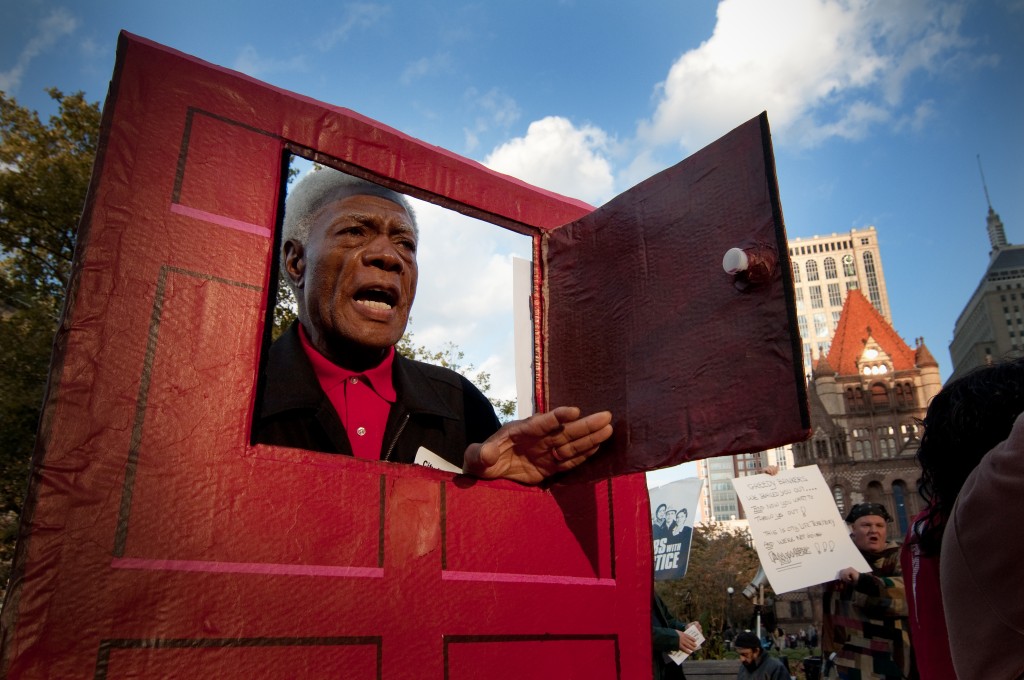 Marshall Cooper, 75 anni, protesta contro la conferenza nazionale dell’American Bankers Association a Copley Square, Boston, nell’ottobre del 2010. La casa di Cooper nel quartiere Dorchester di Boston è stata pignorata all’inizio del 2010. Foto di Kelly Creedon.