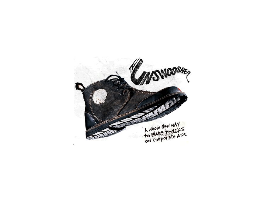 Anche la famosa filosofia anti-branding di AdBusters utilizza solide convenzioni di branding. Ecco una sneaker della loro campagna “black-spot”, nota anche come “unswoosh”.
