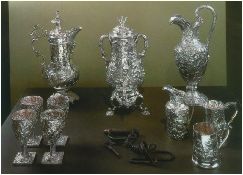 L’installazione “Metalwork 1793–1880” fu un altro modo in cui Wilson rimescolò la collezione del museo per evidenziare la storia degli afroamericani. L’installazione ha giustapposto ornati brocche d’argento, flaconi e tazze da tè con un paio di catene di schiavi di ferro. Tradizionalmente, l’esposizione di arti e mestieri è tenuta separata dalla mostra di artefatti traumatici come le catene di schiavi. Esibendo fianco a fianco questi manufatti, Wilson creò un’atmosfera di disagio e rese evidente il legame tra i due tipi di opere metalliche: la produzione dell’una era resa possibile dalla sottomissione imposta dall’altra. Quando il pubblico ha creato questa connessione, Wilson è riuscito a creare consapevolezza dei pregiudizi che spesso sono alla base delle mostre storiche e, inoltre, del modo in cui questi pregiudizi modellano il significato che attribuiamo a ciò che stiamo vedendo.