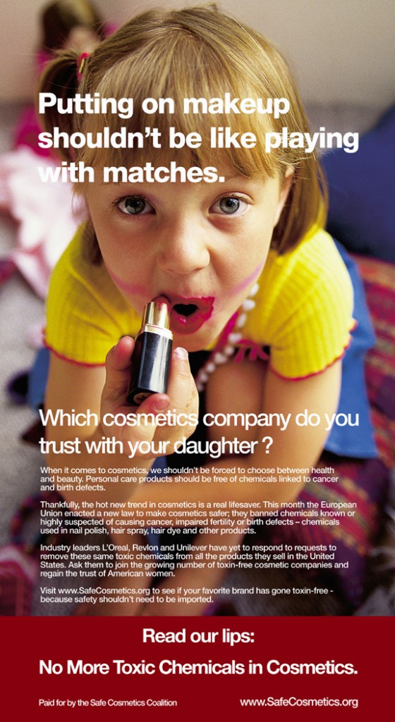 Questa pubblicità creata da SmartMeme nel 2004 (progettata da J. Cookson) utilizza il principio “mostra, non raccontare” per aiutare la campagna Safe Cosmetics ad esercitare pressioni sulle aziende dei cosmetici.