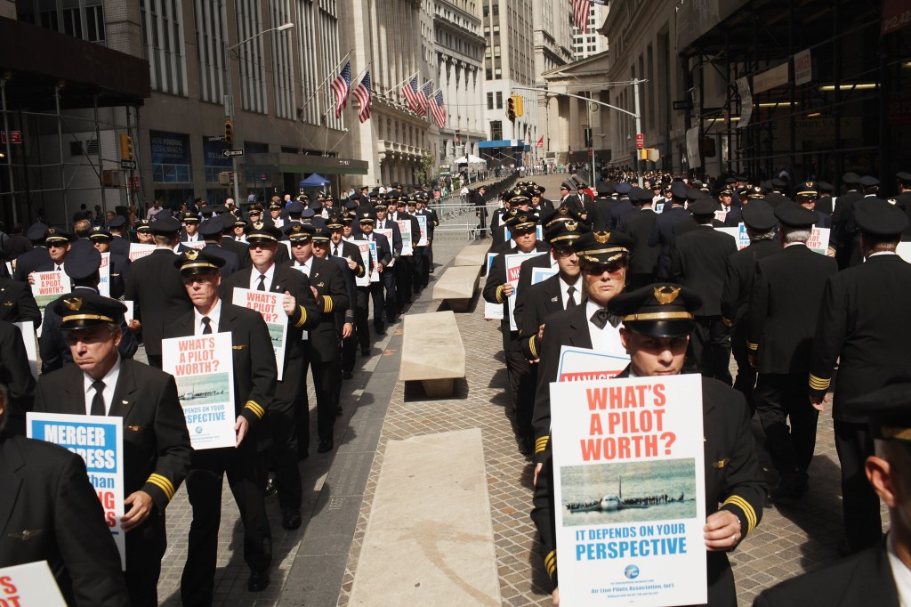 Oltre 700 piloti delle compagnie Continental e United dimostrano di fronte alla Borsa di New York, nel settembre 2011. Le loro uniformi da pilota affilate e la marcia di tipo militare sono molto lontani dallo stereotipo del manifestante standard.