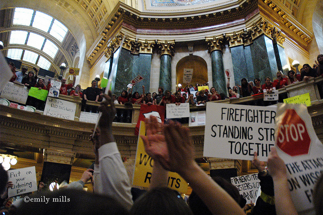Dal 14 febbraio ai primi di marzo 2011, gli oppositori della legge del Governatore Scott Walker, volta a togliere ai sindacati il diritto alla contrattazione collettiva, riempirono il Wisconsin Capitol, il parlamento locale dello stato del Wisconsin, con una protesta continua che è diventata una delle più grandi mobilitazioni del lavoro negli Stati Uniti in una generazione. Sebbene le proteste alla fine non ebbero successo, crearono un grande spartiacque nella resistenza del movimento operaio ai tagli di austerità.