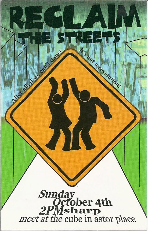 Reclaim the Streets (RTS) iniziò come gruppo di attivisti creativi a Londra, ma le sue tattiche, coniugando festa e protesta, si sono velocemente diffuse in tutto il mondo. Unendo l’azione diretta del movimento britannico contro la costruzione di strade, e la natura carnevalesca della scena rave controculturale, RTS divenne un catalizzatore per i movimenti anticapitalisti globali della fine degli anni ’90.
