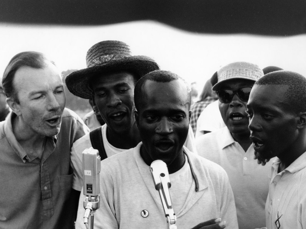 Il cantante folk americano Pete Seeger insieme ad attivisti per i diritti civili a Greenwood, Mississippi, nel 1963, cantano “We Shall Overcome”, un inno afroamericano tradizionale che in seguito divenne emblematico del movimento per i diritti civili negli Stati Uniti. Foto di Adger Cowans / Getty Images.